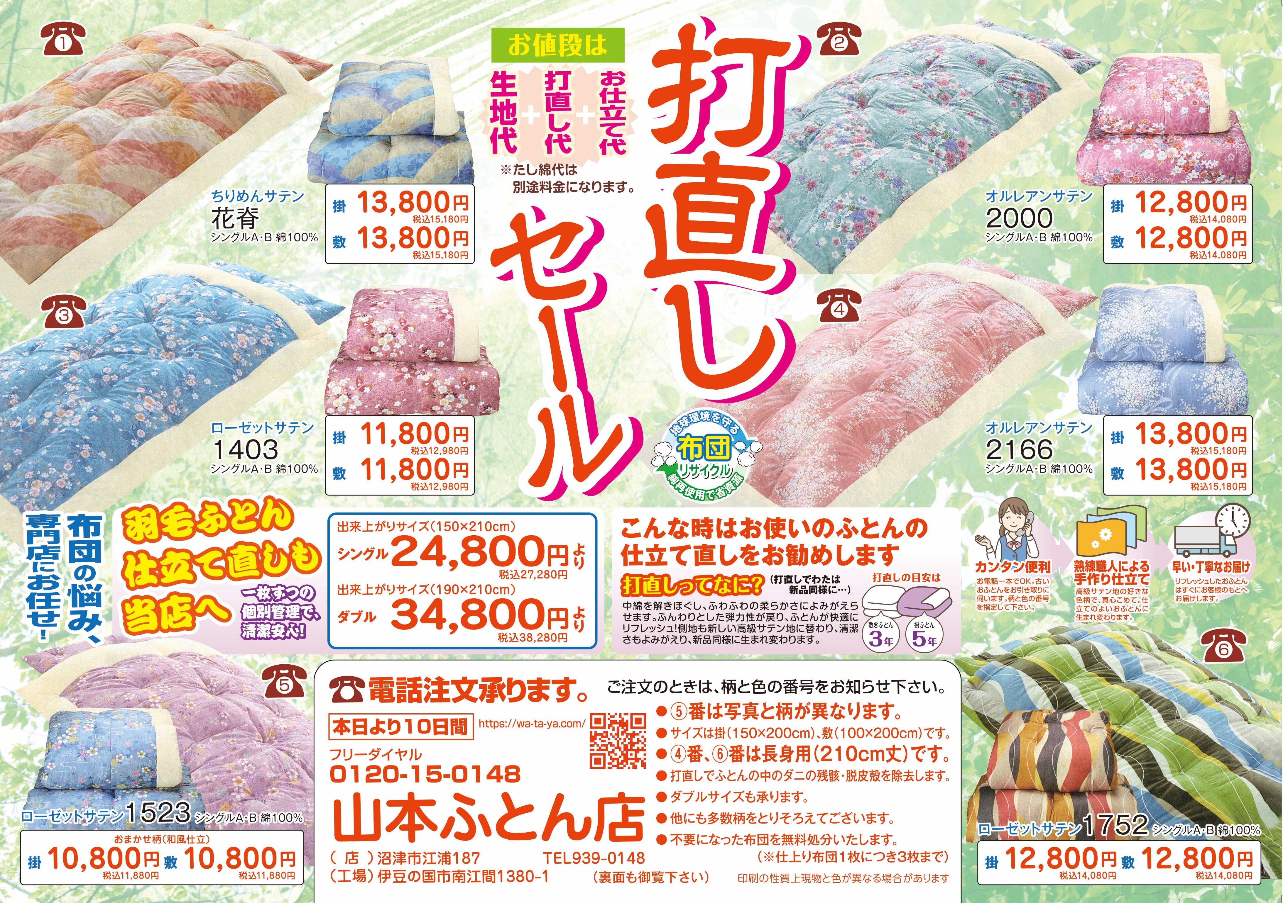 ネット限定 「打ち直しセール」 12月10日まで 始めに「ネットチラシを見た」と 言って頂ければ チラシ価格にてお受けいたします。 宜しくお願いいたします。 ※ 年内納め12月20日迄 ※1番・3番の柄は変更になります。 よろしくお願いいたします。
